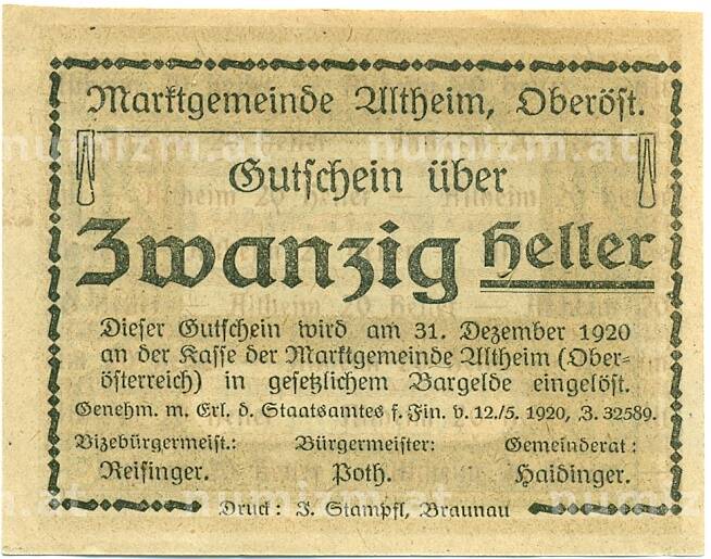 Купить 20 геллеров 1920 года Австрия — Альтхайм (Нотгельд) по привлекательной цене можно в нашем интернет-магазине — Вам достаточно оформить заказ на сайте. Все монеты, представленные в каталоге, находятся в наличии на нашем складе.