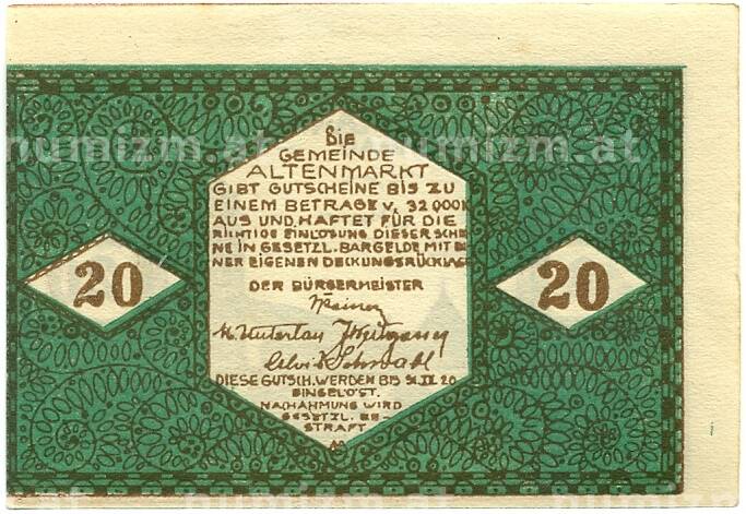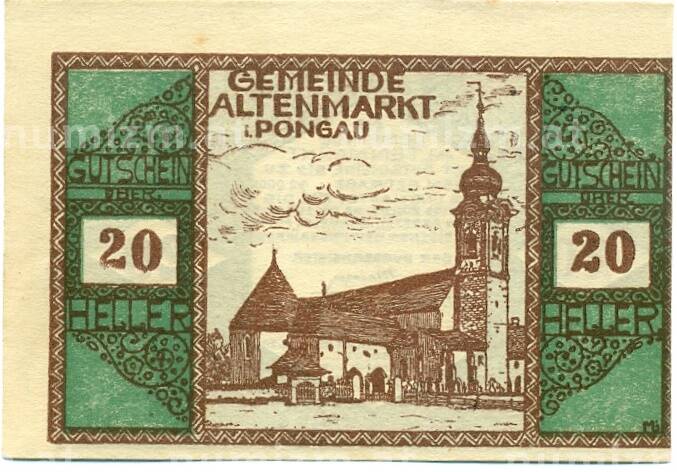 Купить 20 геллеров 1920 года Австрия — Коммуна Альтенмаркт (Нотгельд) по привлекательной цене можно в нашем интернет-магазине — Вам достаточно оформить заказ на сайте. Все монеты, представленные в каталоге, находятся в наличии на нашем складе.
