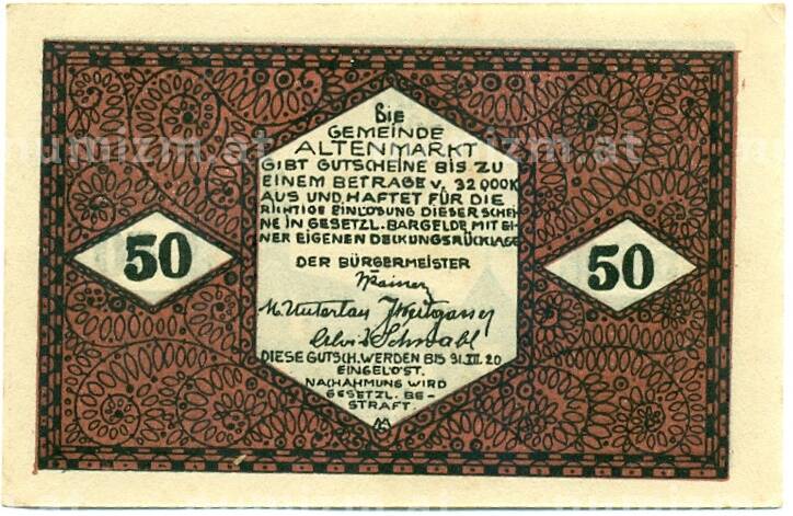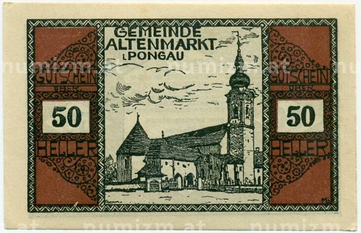 Купить 50 геллеров 1920 года Австрия — Коммуна Альтенмаркт (Нотгельд) по привлекательной цене можно в нашем интернет-магазине — Вам достаточно оформить заказ на сайте. Все монеты, представленные в каталоге, находятся в наличии на нашем складе.