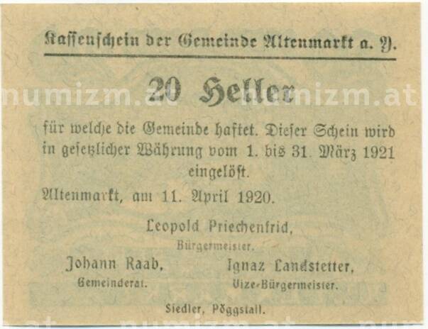 Купить 20 геллеров 1920 года Австрия — Коммуна Альтенмаркт-ан-дер-Тристинг (Нотгельд) по привлекательной цене можно в нашем интернет-магазине — Вам достаточно оформить заказ на сайте. Все монеты, представленные в каталоге, находятся в наличии на нашем складе.