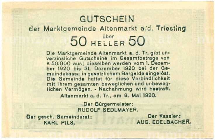 Купить 50 геллеров 1920 года Австрия — Коммуна Альтенмаркт (Нотгельд) по привлекательной цене можно в нашем интернет-магазине — Вам достаточно оформить заказ на сайте. Все монеты, представленные в каталоге, находятся в наличии на нашем складе.