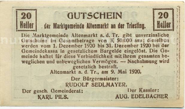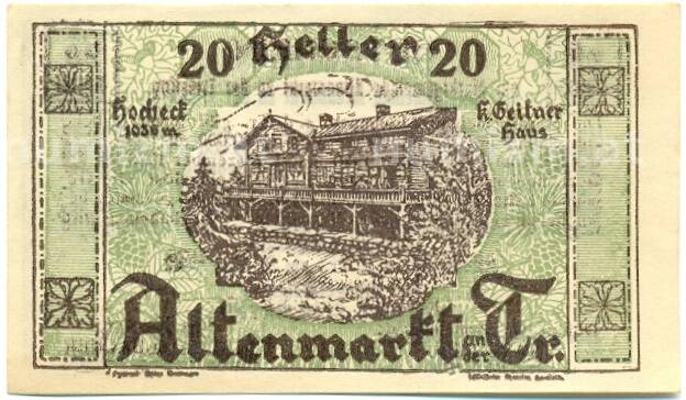 Банкнота 20 геллеров 1920 года Австрия — Коммуна Альтенмаркт (Нотгельд) (Артикул: B2-15244): подробные характеристики, качественные фотографии в высоком разрешении, низкая цена.