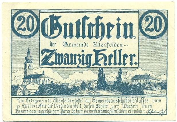 Купить 20 геллеров 1920 года Австрия — Коммуна Альтенфельден (Нотгельд) по привлекательной цене можно в нашем интернет-магазине — Вам достаточно оформить заказ на сайте. Все монеты, представленные в каталоге, находятся в наличии на нашем складе.