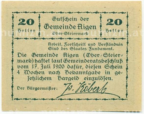 Купить 20 геллеров 1920 года Австрия — Айген (Нотгельд) по привлекательной цене можно в нашем интернет-магазине — Вам достаточно оформить заказ на сайте. Все монеты, представленные в каталоге, находятся в наличии на нашем складе.