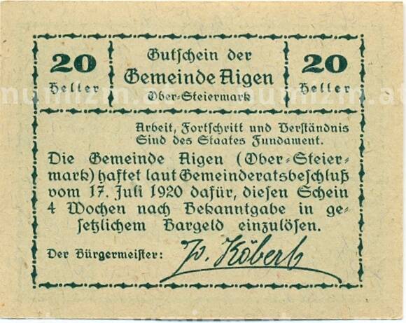 Купить 20 геллеров 1920 года Австрия — Айген (Нотгельд) по привлекательной цене можно в нашем интернет-магазине — Вам достаточно оформить заказ на сайте. Все монеты, представленные в каталоге, находятся в наличии на нашем складе.