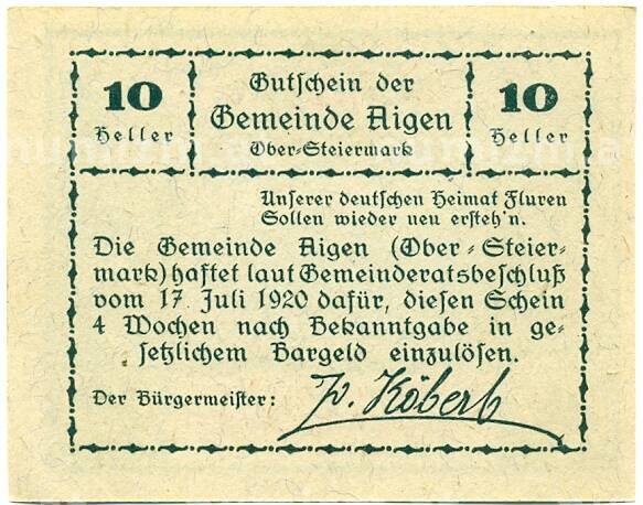 Купить 10 геллеров 1920 года Австрия — Айген (Нотгельд) по привлекательной цене можно в нашем интернет-магазине — Вам достаточно оформить заказ на сайте. Все монеты, представленные в каталоге, находятся в наличии на нашем складе.