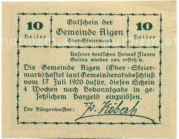 Купить 10 геллеров 1920 года Австрия — Айген (Нотгельд) по привлекательной цене можно в нашем интернет-магазине — Вам достаточно оформить заказ на сайте. Все монеты, представленные в каталоге, находятся в наличии на нашем складе.