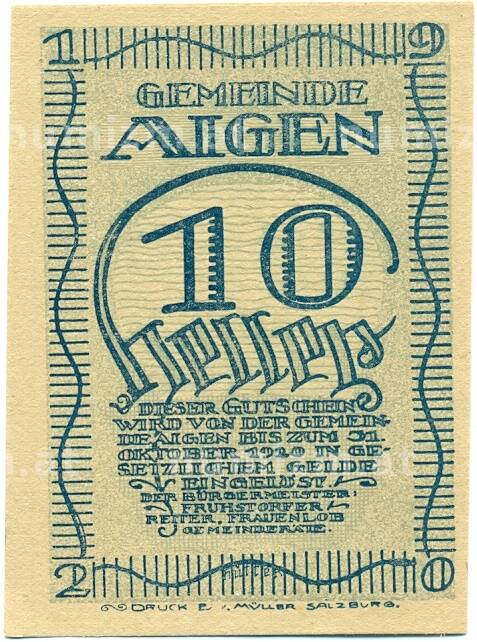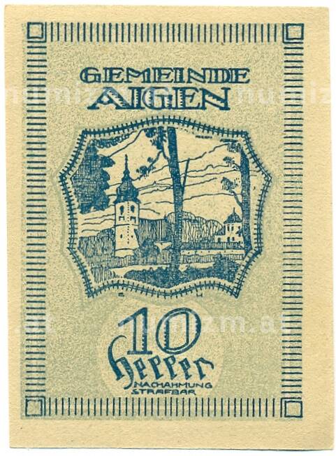 Банкнота 10 геллеров 1920 года Австрия — Айген (Нотгельд) (Артикул: B2-15280): подробные характеристики, качественные фотографии в высоком разрешении, низкая цена.