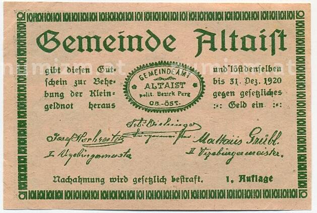 Купить 20 геллеров 1920 года Австрия — Альтаист (Нотгельд) по привлекательной цене можно в нашем интернет-магазине — Вам достаточно оформить заказ на сайте. Все монеты, представленные в каталоге, находятся в наличии на нашем складе.