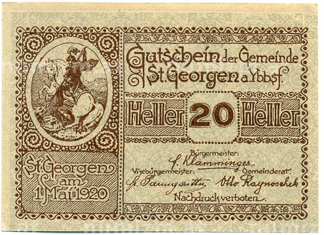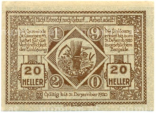 Купить 20 геллеров 1920 года Австрия — Санкт-Георген-ам-Ибсфельд (Нотгельд) по привлекательной цене можно в нашем интернет-магазине — Вам достаточно оформить заказ на сайте. Все монеты, представленные в каталоге, находятся в наличии на нашем складе.