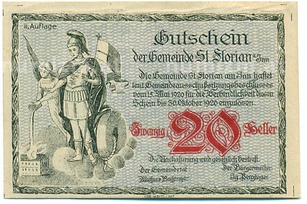 Купить 20 геллеров 1920 года Австрия — Санкт-Флориан-ам-Инн (Нотгельд) по привлекательной цене можно в нашем интернет-магазине — Вам достаточно оформить заказ на сайте. Все монеты, представленные в каталоге, находятся в наличии на нашем складе.