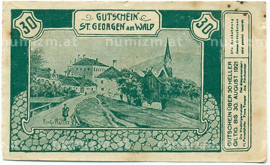 Купить 30 геллеров 1921 года Австрия — Санкт-Георген-на-Вальде (Нотгельд) по привлекательной цене можно в нашем интернет-магазине — Вам достаточно оформить заказ на сайте. Все монеты, представленные в каталоге, находятся в наличии на нашем складе.