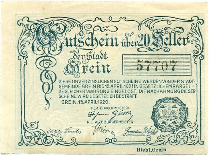 Купить 20 геллеров 1920 года Австрия — Грайн (Нотгельд) по привлекательной цене можно в нашем интернет-магазине — Вам достаточно оформить заказ на сайте. Все монеты, представленные в каталоге, находятся в наличии на нашем складе.