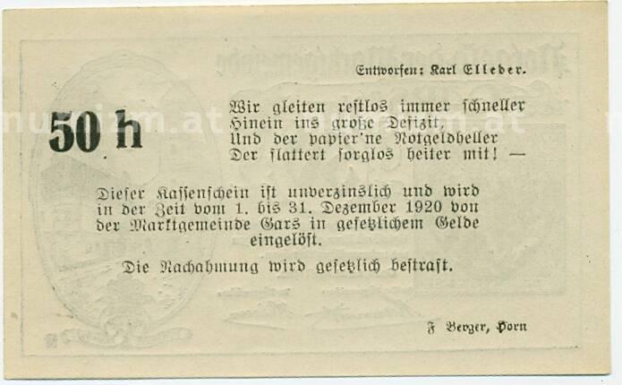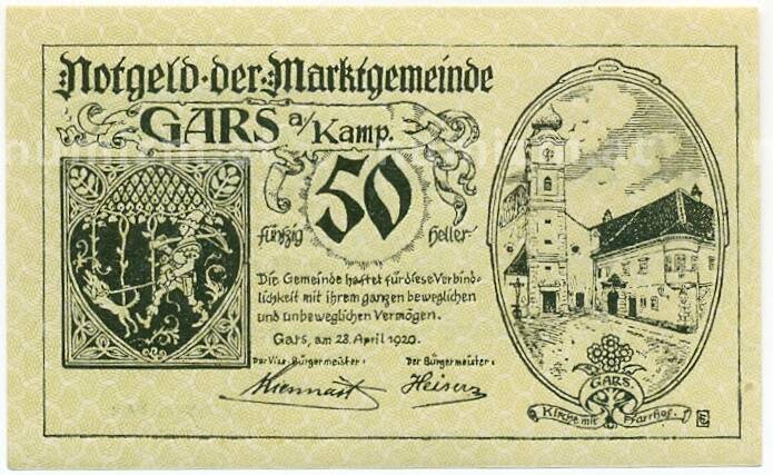 Купить 50 геллеров 1920 года Австрия — Гарс-ам-Камп (Нотгельд) по привлекательной цене можно в нашем интернет-магазине — Вам достаточно оформить заказ на сайте. Все монеты, представленные в каталоге, находятся в наличии на нашем складе.