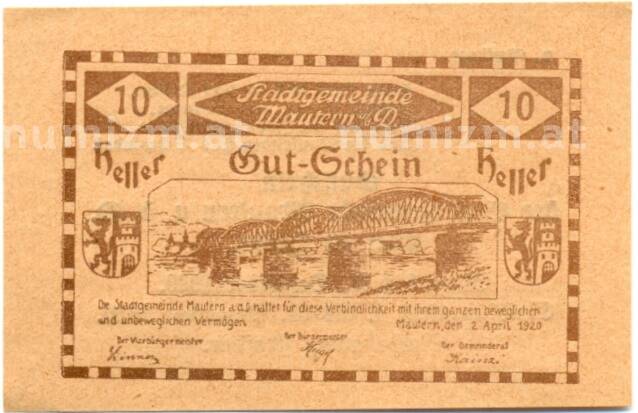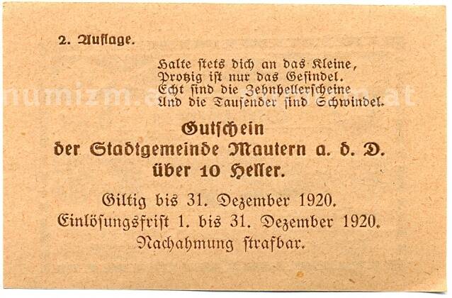 Банкнота 10 геллеров 1920 года Австрия — Маутерн-на-Дунае (Нотгельд) (Артикул: B2-15401): подробные характеристики, качественные фотографии в высоком разрешении, низкая цена.