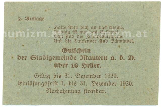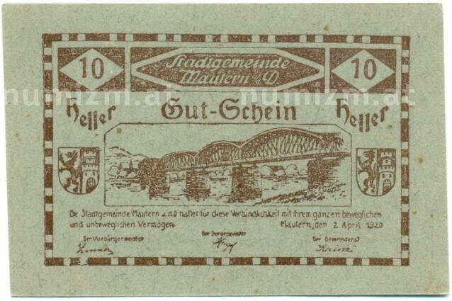 Купить 10 геллеров 1920 года Австрия — Маутерн-на-Дунае (Нотгельд) по привлекательной цене можно в нашем интернет-магазине — Вам достаточно оформить заказ на сайте. Все монеты, представленные в каталоге, находятся в наличии на нашем складе.