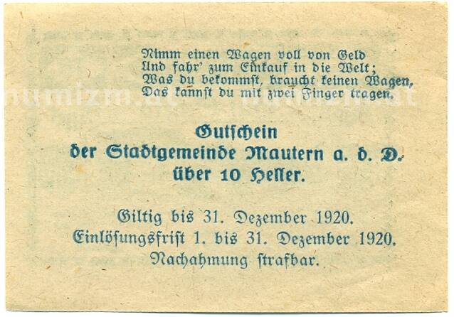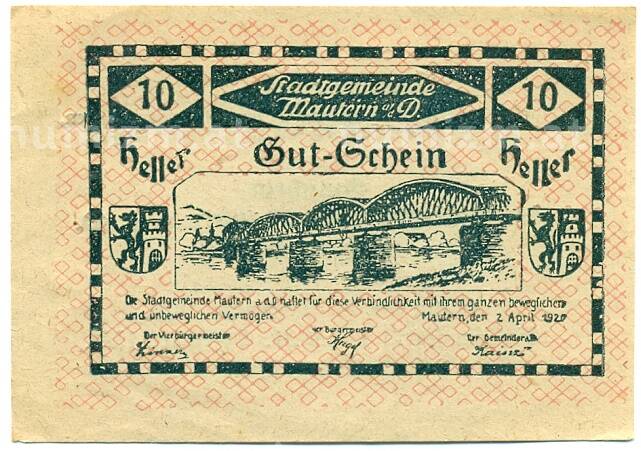 Банкнота 10 геллеров 1920 года Австрия — Маутерн-на-Дунае (Нотгельд) (Артикул: B2-15406): подробные характеристики, качественные фотографии в высоком разрешении, низкая цена.