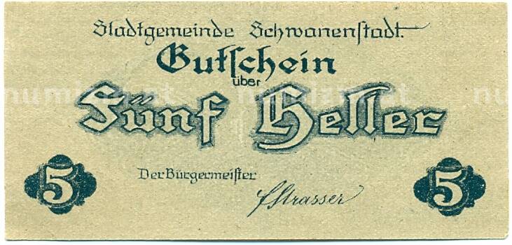 Банкнота 5 геллеров 1920 года Австрия — Шваненштадт (Нотгельд) (Артикул: B2-15463): подробные характеристики, качественные фотографии в высоком разрешении, низкая цена.