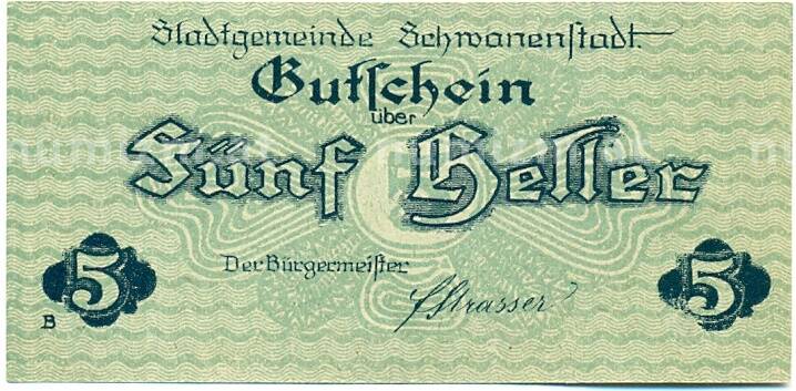 Купить 5 геллеров 1920 года Австрия — Шваненштадт (Нотгельд) по привлекательной цене можно в нашем интернет-магазине — Вам достаточно оформить заказ на сайте. Все монеты, представленные в каталоге, находятся в наличии на нашем складе.