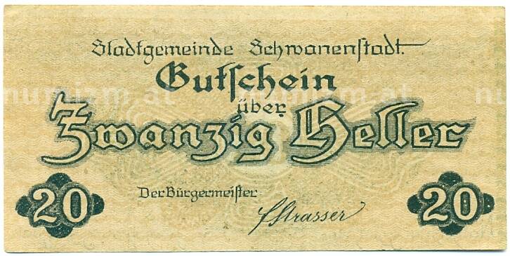 Купить 20 геллеров 1920 года Австрия — Шваненштадт (Нотгельд) по привлекательной цене можно в нашем интернет-магазине — Вам достаточно оформить заказ на сайте. Все монеты, представленные в каталоге, находятся в наличии на нашем складе.