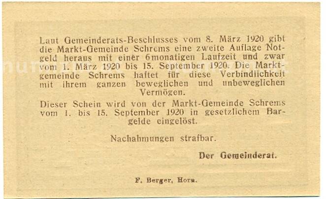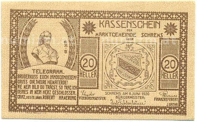 Купить 20 геллеров 1920 года Австрия — Шремс (Нотгельд) по привлекательной цене можно в нашем интернет-магазине — Вам достаточно оформить заказ на сайте. Все монеты, представленные в каталоге, находятся в наличии на нашем складе.