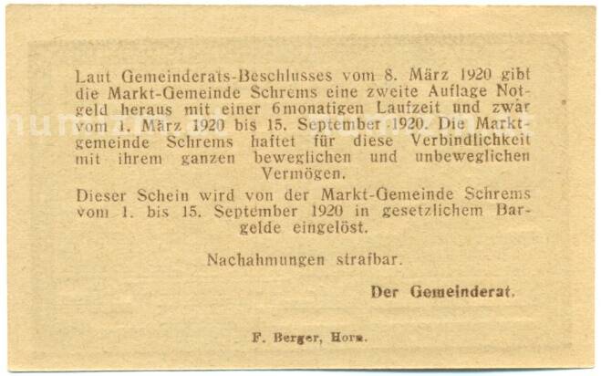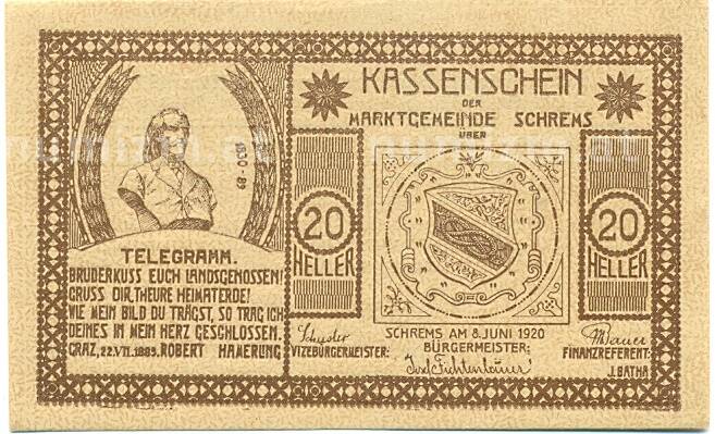 Банкнота 20 геллеров 1920 года Австрия — Шремс (Нотгельд) (Артикул: B2-15474): подробные характеристики, качественные фотографии в высоком разрешении, низкая цена.