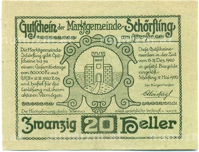Купить 20 геллеров 1920 года Австрия — Шерфлинг-ам-Аттерзе (Нотгельд) по привлекательной цене можно в нашем интернет-магазине — Вам достаточно оформить заказ на сайте. Все монеты, представленные в каталоге, находятся в наличии на нашем складе.