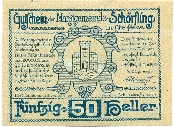 Купить 50 геллеров 1920 года Австрия — Шерфлинг-ам-Аттерзе (Нотгельд) по привлекательной цене можно в нашем интернет-магазине — Вам достаточно оформить заказ на сайте. Все монеты, представленные в каталоге, находятся в наличии на нашем складе.