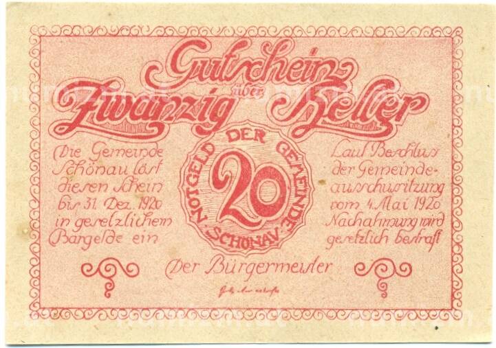Купить 20 геллеров 1920 года Австрия — Шенау-им-Мюлькрайс (Нотгельд) по привлекательной цене можно в нашем интернет-магазине — Вам достаточно оформить заказ на сайте. Все монеты, представленные в каталоге, находятся в наличии на нашем складе.