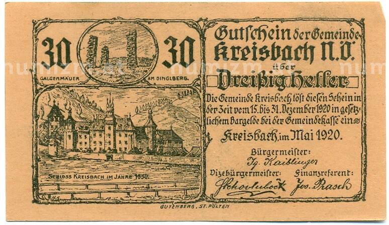 Купить 30 геллеров 1920 года Австрия — Крайсбах (Нотгельд) по привлекательной цене можно в нашем интернет-магазине — Вам достаточно оформить заказ на сайте. Все монеты, представленные в каталоге, находятся в наличии на нашем складе.