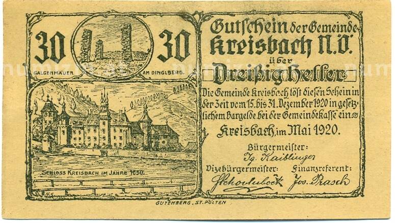 Банкнота 30 геллеров 1920 года Австрия — Крайсбах (Нотгельд) (Артикул: B2-15523): подробные характеристики, качественные фотографии в высоком разрешении, низкая цена.
