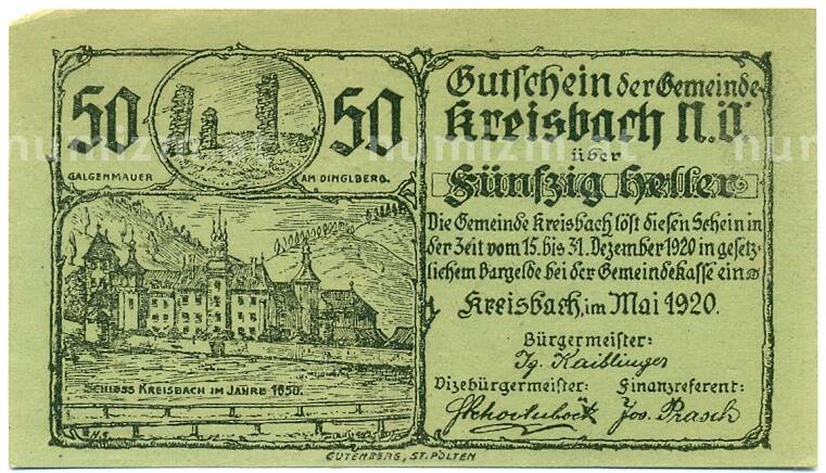 Купить 50 геллеров 1920 года Австрия — Крайсбах (Нотгельд) по привлекательной цене можно в нашем интернет-магазине — Вам достаточно оформить заказ на сайте. Все монеты, представленные в каталоге, находятся в наличии на нашем складе.