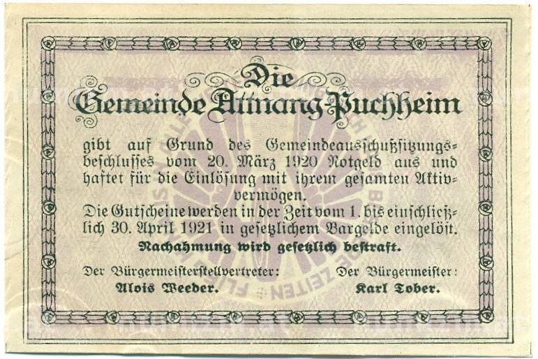 Купить 50 геллеров 1920 года Австрия — Атнанг-Пуххайм (Нотгельд) по привлекательной цене можно в нашем интернет-магазине — Вам достаточно оформить заказ на сайте. Все монеты, представленные в каталоге, находятся в наличии на нашем складе.
