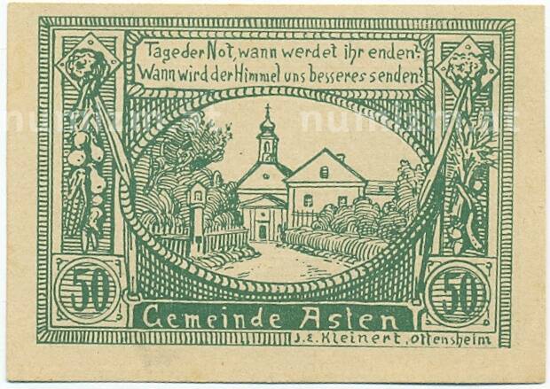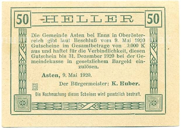 Купить 50 геллеров 1920 года Австрия — Астен (Нотгельд) по привлекательной цене можно в нашем интернет-магазине — Вам достаточно оформить заказ на сайте. Все монеты, представленные в каталоге, находятся в наличии на нашем складе.