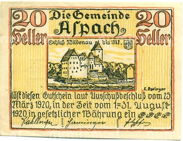 Купить 20 геллеров 1920 года Австрия — Аспах (Нотгельд) по привлекательной цене можно в нашем интернет-магазине — Вам достаточно оформить заказ на сайте. Все монеты, представленные в каталоге, находятся в наличии на нашем складе.