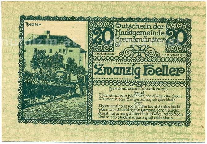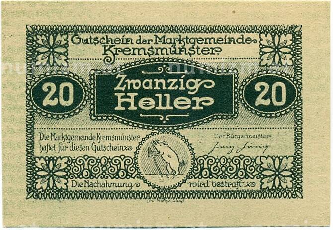 Купить 20 геллеров 1920 года Австрия — Кремсмюнстер (Нотгельд) по привлекательной цене можно в нашем интернет-магазине — Вам достаточно оформить заказ на сайте. Все монеты, представленные в каталоге, находятся в наличии на нашем складе.