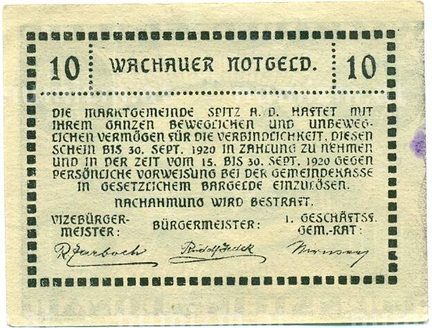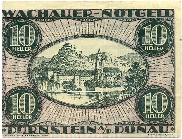Банкнота 10 геллеров 1920 года Австрия — Вахау (Нотгельд) (Артикул: B2-15671): подробные характеристики, качественные фотографии в высоком разрешении, низкая цена.