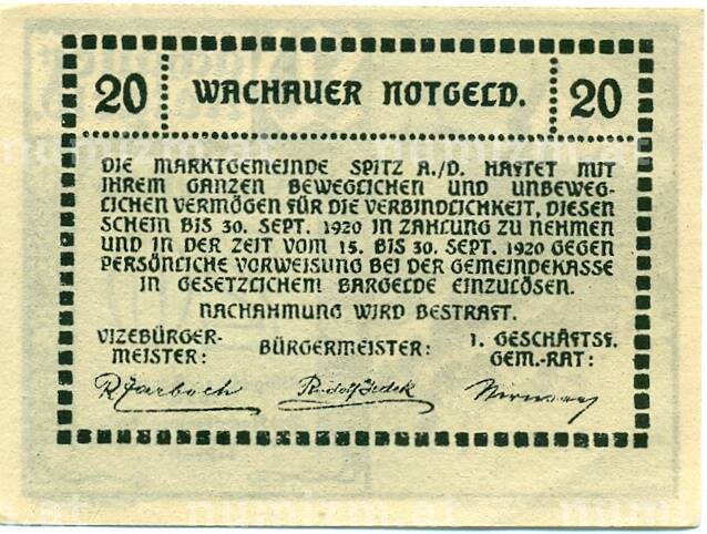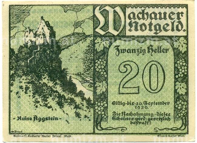 Банкнота 20 геллеров 1920 года Австрия — Вахау (Нотгельд) (Артикул: B2-15674): подробные характеристики, качественные фотографии в высоком разрешении, низкая цена.