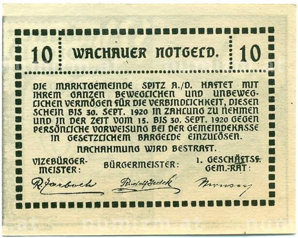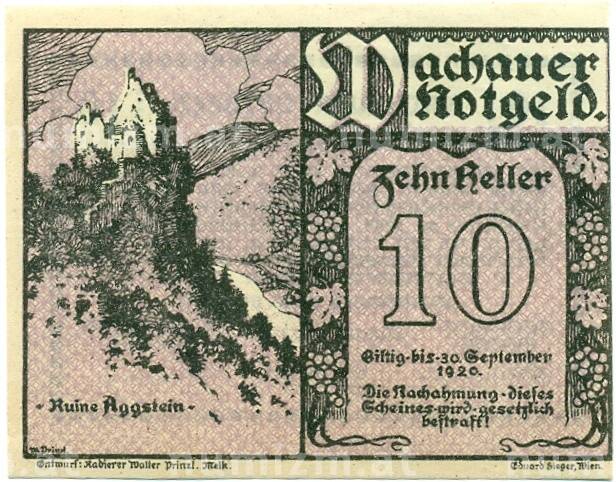 Банкнота 10 геллеров 1920 года Австрия — Вахау (Нотгельд) (Артикул: B2-15675): подробные характеристики, качественные фотографии в высоком разрешении, низкая цена.
