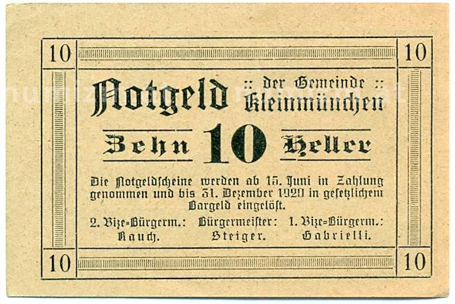 Купить 10 геллеров 1920 года Австрия — Кляйнмюнхен (Нотгельд) по привлекательной цене можно в нашем интернет-магазине — Вам достаточно оформить заказ на сайте. Все монеты, представленные в каталоге, находятся в наличии на нашем складе.