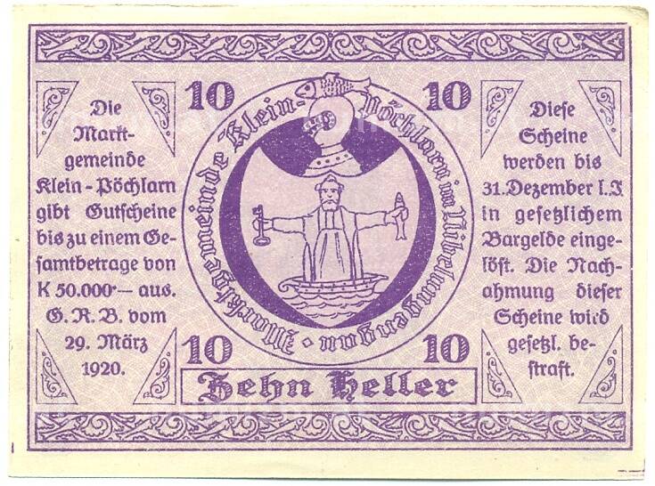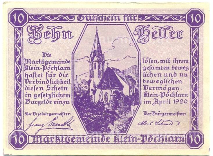 Банкнота 10 геллеров 1920 года Австрия — Клайн-Пехларн (Нотгельд) (Артикул: B2-15761): подробные характеристики, качественные фотографии в высоком разрешении, низкая цена.