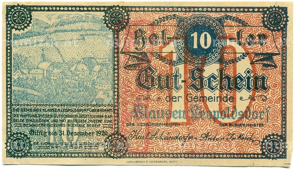 Купить 10 геллеров 1920 года Австрия — Клаузен-Леопольдсдорф (Нотгельд) по привлекательной цене можно в нашем интернет-магазине — Вам достаточно оформить заказ на сайте. Все монеты, представленные в каталоге, находятся в наличии на нашем складе.