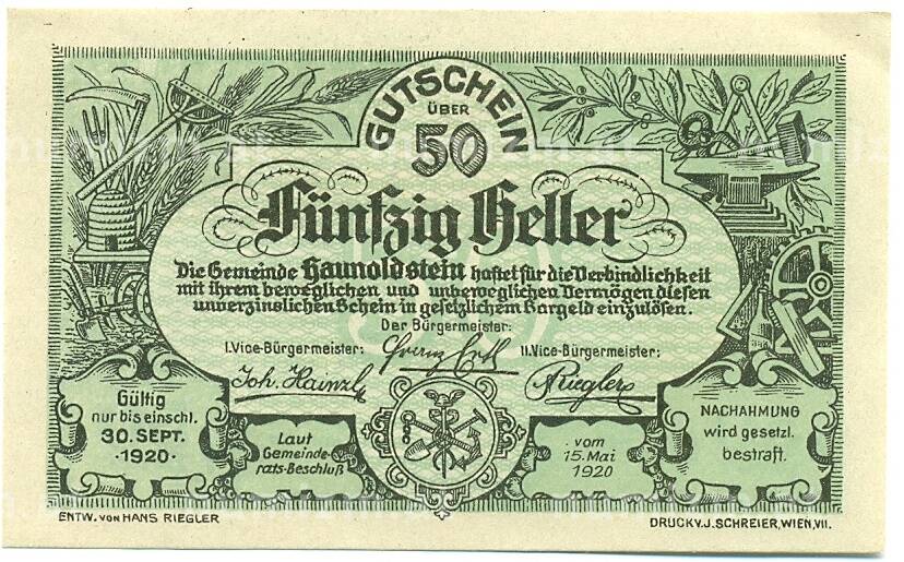 Купить 50 геллеров 1920 года Австрия — Хаунольдштайн (Нотгельд) по привлекательной цене можно в нашем интернет-магазине — Вам достаточно оформить заказ на сайте. Все монеты, представленные в каталоге, находятся в наличии на нашем складе.