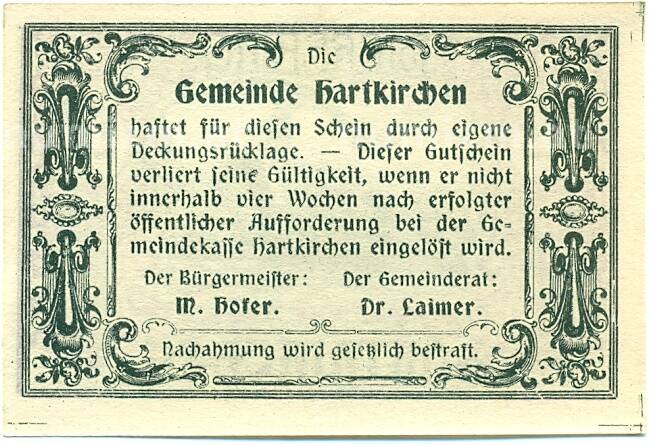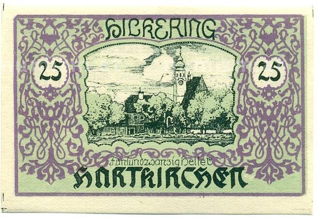 Банкнота 25 геллеров 1920 года Австрия — Харткирхен (Нотгельд) (Артикул: B2-15772): подробные характеристики, качественные фотографии в высоком разрешении, низкая цена.