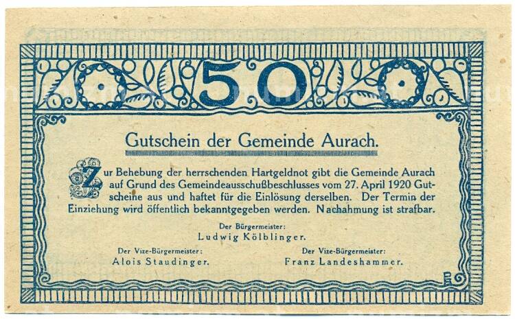 Купить 50 геллеров 1920 года Австрия — община Аурах (Нотгельд) по привлекательной цене можно в нашем интернет-магазине — Вам достаточно оформить заказ на сайте. Все монеты, представленные в каталоге, находятся в наличии на нашем складе.