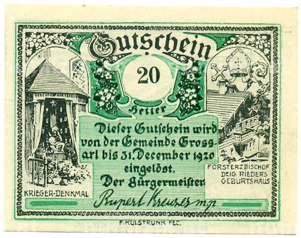 Купить 20 геллеров 1920 года Австрия — Гроссарль (Нотгельд) по привлекательной цене можно в нашем интернет-магазине — Вам достаточно оформить заказ на сайте. Все монеты, представленные в каталоге, находятся в наличии на нашем складе.
