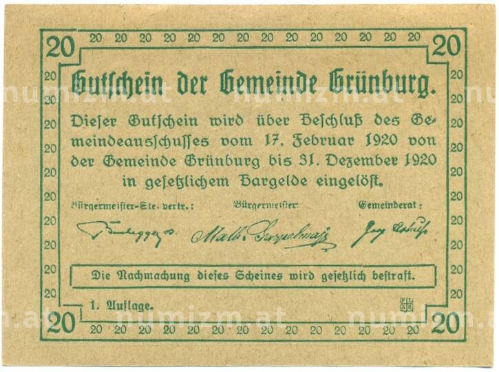 Купить 20 геллеров 1920 года Австрия — Грюнбург (Нотгельд) по привлекательной цене можно в нашем интернет-магазине — Вам достаточно оформить заказ на сайте. Все монеты, представленные в каталоге, находятся в наличии на нашем складе.