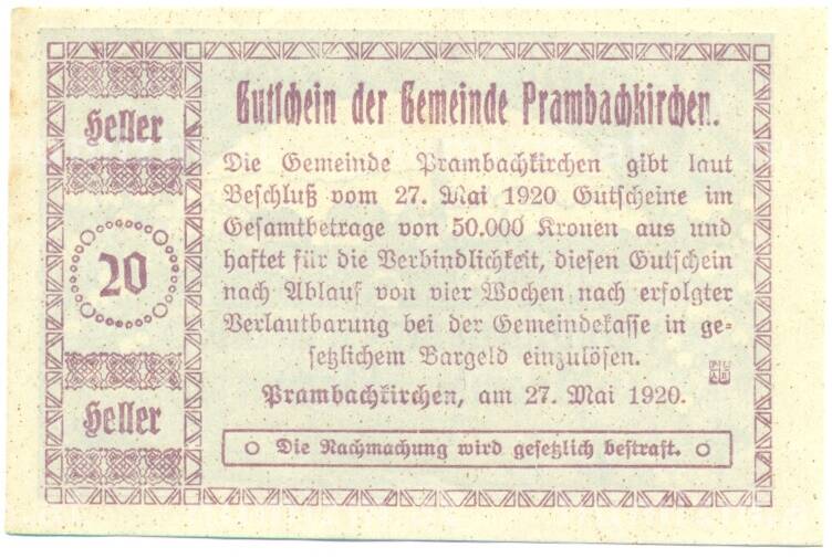 Купить 20 геллеров 1920 года Австрия — Прамбахкирхен (Нотгельд) по привлекательной цене можно в нашем интернет-магазине — Вам достаточно оформить заказ на сайте. Все монеты, представленные в каталоге, находятся в наличии на нашем складе.