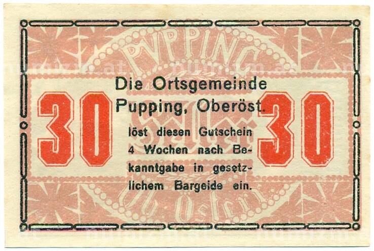 Банкнота 30 геллеров 1920 года Австрия — община Пуппинг (Нотгельд) (Артикул: B2-16071): подробные характеристики, качественные фотографии в высоком разрешении, низкая цена.
