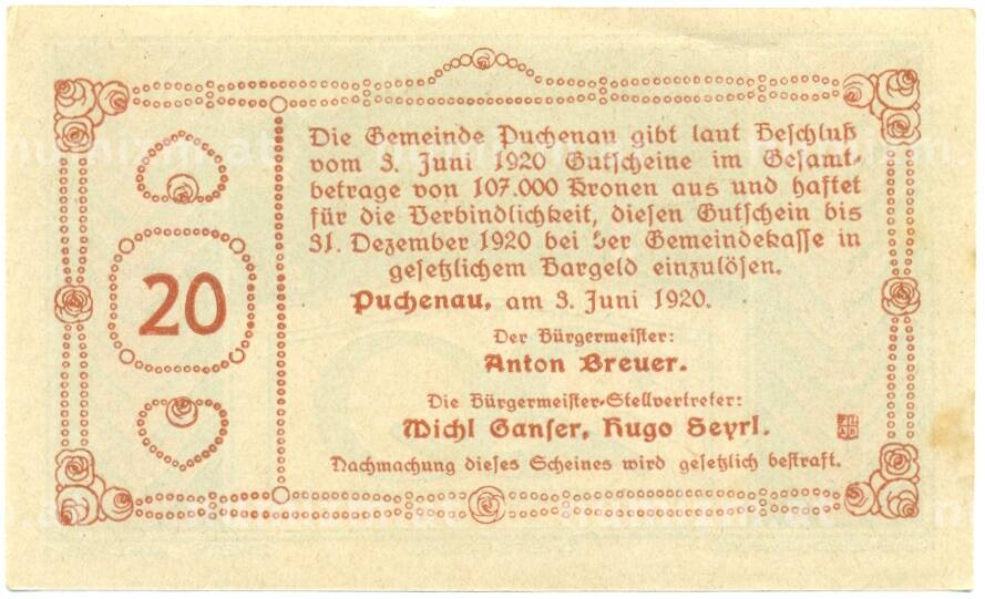 Купить 20 геллеров 1920 года Австрия — Пухенау (Нотгельд) по привлекательной цене можно в нашем интернет-магазине — Вам достаточно оформить заказ на сайте. Все монеты, представленные в каталоге, находятся в наличии на нашем складе.